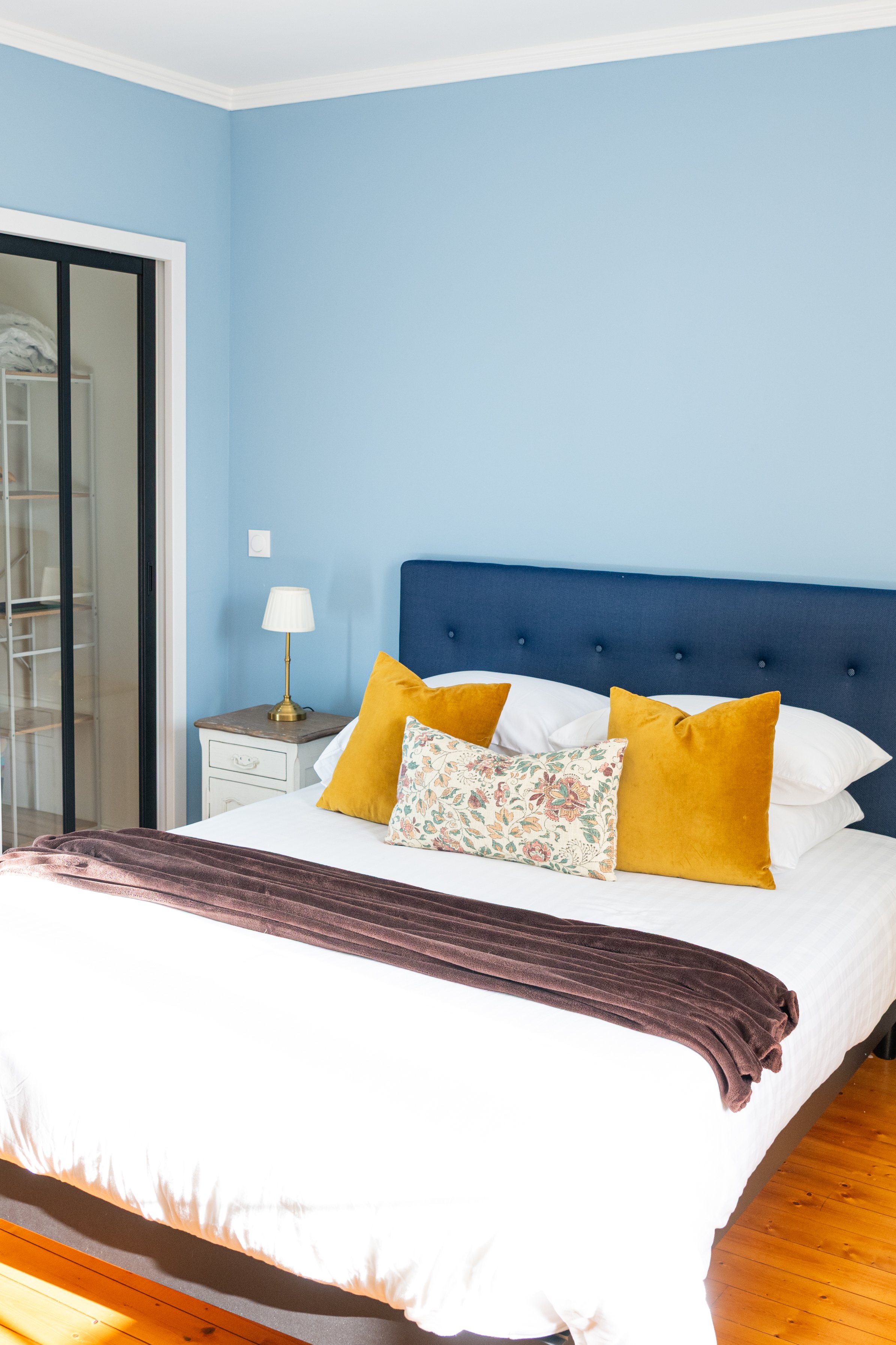 Son papier peint panoramique en tête de lit crée une atmosphère immersive et singulière, sublimée par la lumière naturelle.