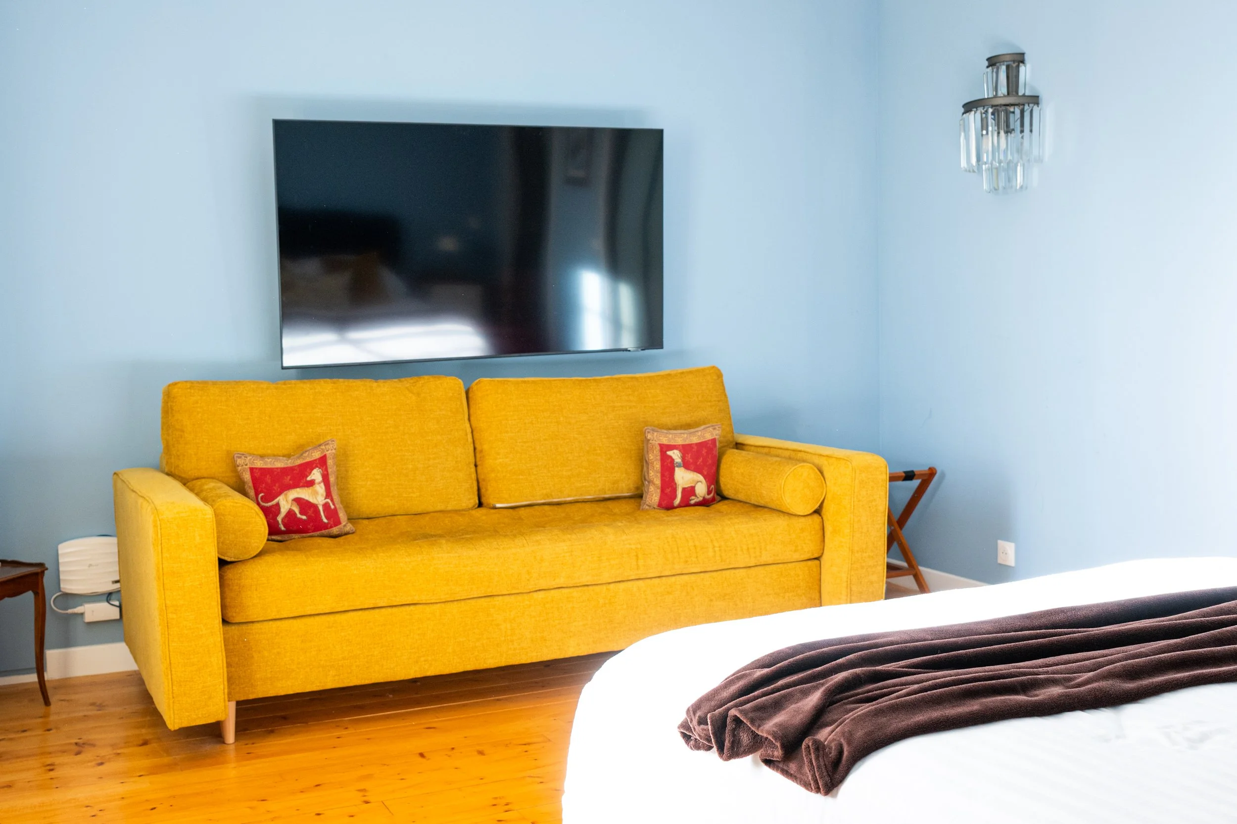 Coin salon : canapé-lit (couchage 140cm), fauteuil, TV (câble, Netflix)